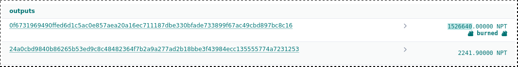 @aszepieniec added a small patch to the block explorer to indicate burned outputs. The most significant burn to date was 1,526,640.0 NPT, and can be viewed here